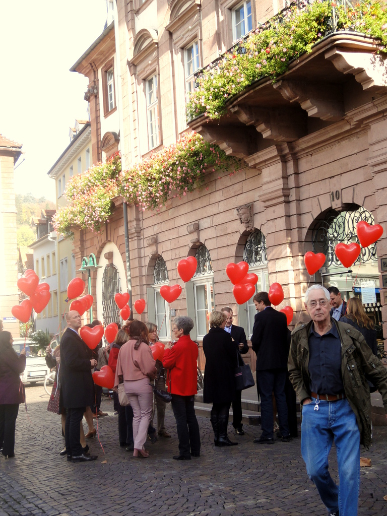 「市集廣場」是海德堡人潮聚集的地方,夏天周圍有許多露天咖啡座。那天某飯店正舉行婚筵,賓客拿著紅色愛心氣球,準備歡送新人。