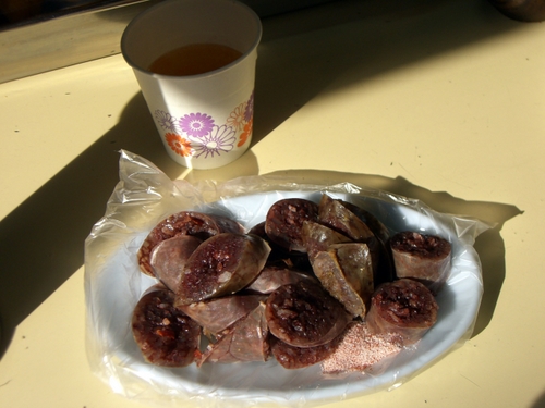 回到正題,血腸是豬腸裡塞進糯米、冬粉和豬血,通常路邊攤有兩