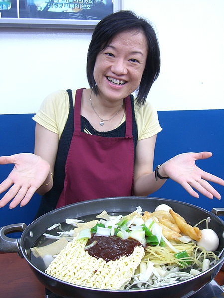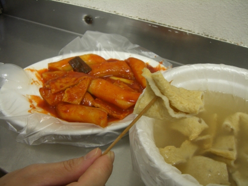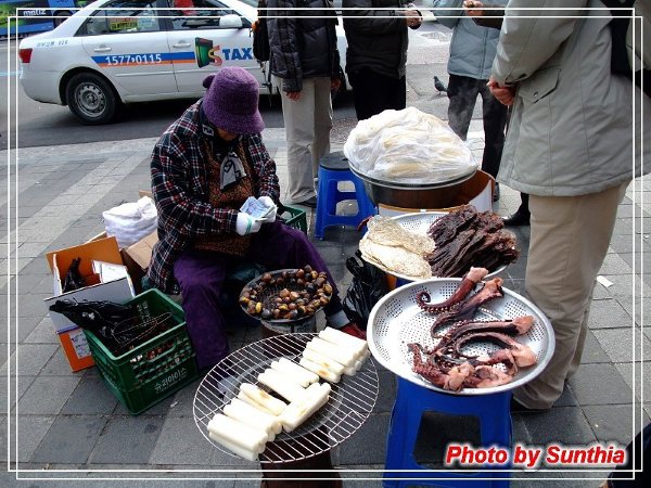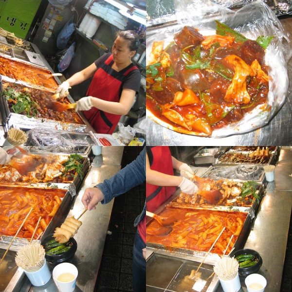 上上圖) 賣的東西有辣炒年糕、魚板、紫菜捲飯。她的年糕入味又很