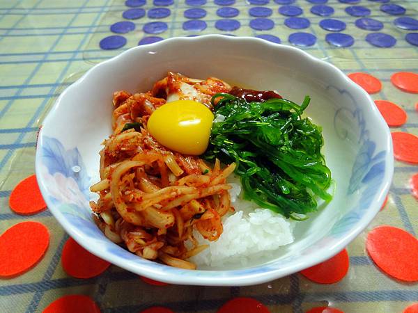 (補第一張照片圖說,懶人拌飯,綠色海帶芽不是韓國泡菜,而是家樂福買
