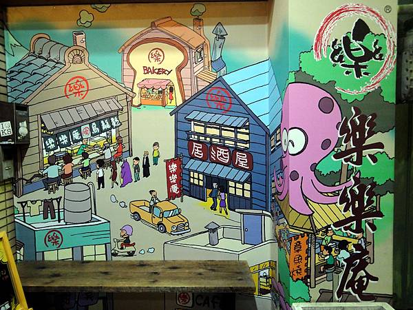 民享街這家居酒屋式的樂樂庵,聽說是創始店,從店外的壁畫可以窺見,老闆是