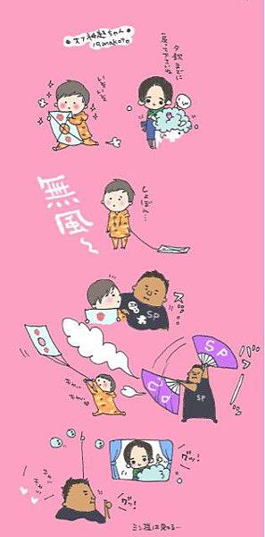 風,允浩沒辦法放風箏;(圖三)胖哥哥說沒關係,拿著大扇子搧起大風,允浩順利放了風箏