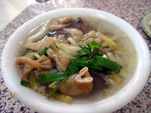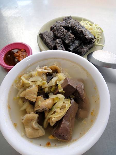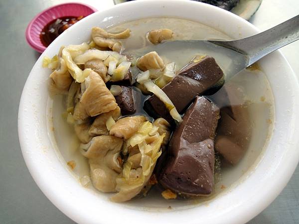 它們的豬血湯真的是古早味,多種豬內臟、菜頭和紅蔥頭熬成湯頭,甘甜清爽不油膩,