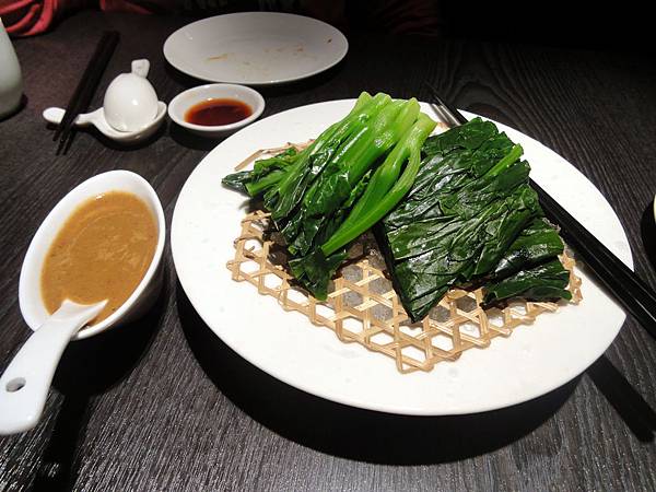川燙過的芥藍菜放在碎冰上(隔著竹簍片)上桌,特別的是它的醬汁,