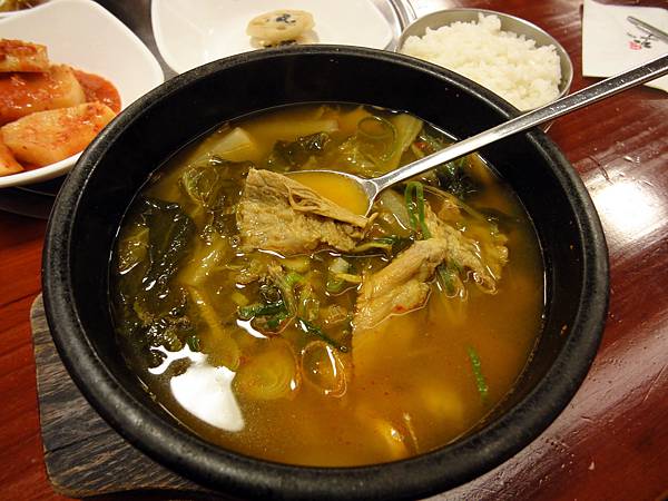 牛大骨熬成的湯頭甘醇細緻,我開始先一口湯一口白飯再一口泡菜,吃了半碗,才學
