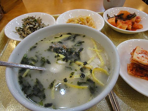 我只叫一碗【年糕湯】,四盤小菜依例送上不含糊,泡菜、蘿蔔、黃豆芽、小魚乾,光吃