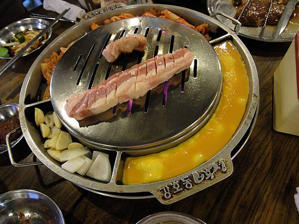 烤盤設計蠻特別,中間是烤肉區,周圍三等分,分別用來烤蛋、烤泡菜、烤大蒜洋蔥,它