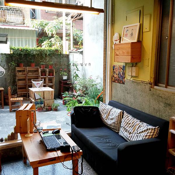 ,先在門口拍了著名店標--貝果三輪車,轉身鑽進老屋大門。店裡空無一人,落地玻璃前沙發