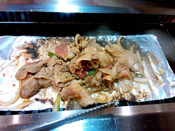,霧面刷油後把燒肉連同洋蔥等青菜放在鋁箔紙上拌炒,記得是拌炒不是燒烤喔,烤熟後服務
