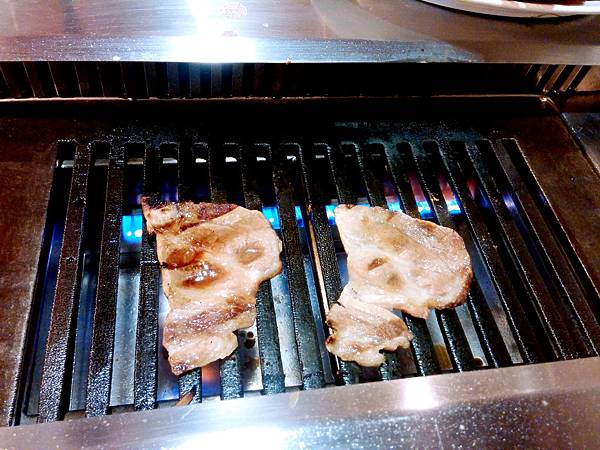 <五花肉>直接在烤盤上刷油炙烤,當肉的邊緣烤到冒泡泡就翻面,豬肉要烤全熟、邊邊帶點