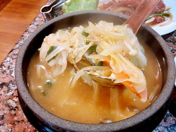 韓式味噌湯就是《大醬湯》,比日式味噌湯口味重一些辣一些,裏頭有青菜、蛤蜊、金針菇、肉