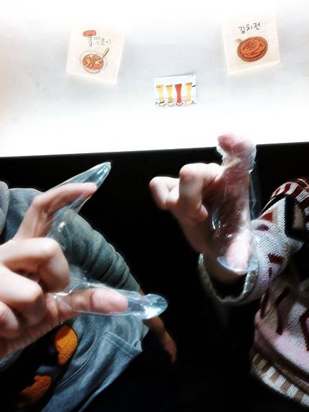 我們不管放在桌上的手指手套,徒手就去搶食,還真的被燙到手