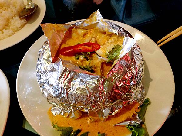 招牌料理【火燒島】是由鋁箔紙包著海鮮和椰漿咖哩烘烤而成,不是很辣倒是有點甜,