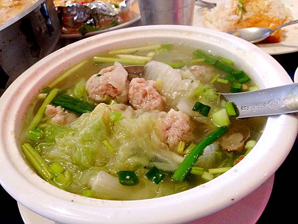 為平衡重口味的配菜,我們捨棄酸辣海鮮湯、辣味竹筍XX湯,選擇【肉丸白菜湯】,