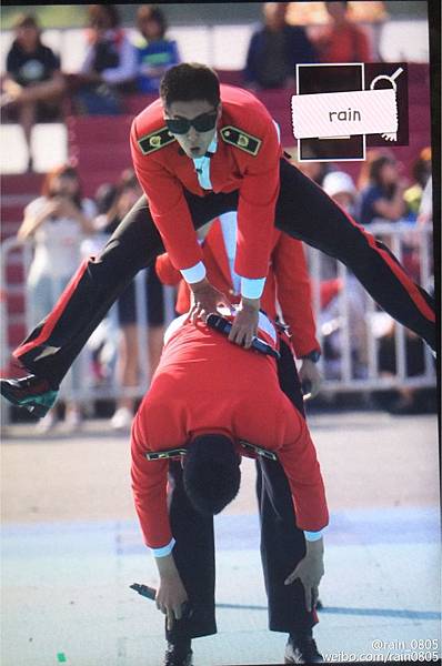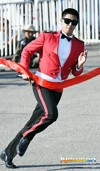 下台才發現自己出糗的允浩,只好用藍外套遮褲檔,以聲東擊西之計躲開粉絲逃上車,