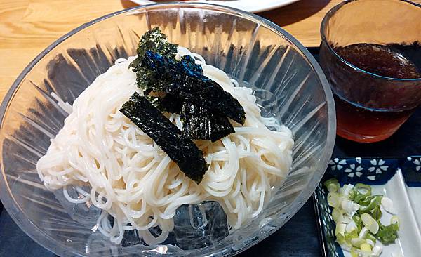 日式素麵是涼麵,像麵線的麵條放在冰塊上冰鎮,放越久口感越Q
