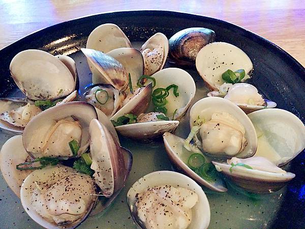 當季肥美的蛤蜊淋上白酒下鍋蒸,一開口便撒下蔥末起鍋,